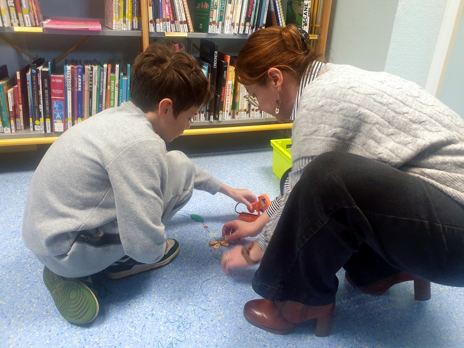 Du fil de couleur pas trop épais, du papier vert type Canson, des gommettes autocollantes rouges, des noeuds dorés, un pistolet à colle pour l'assemblage et une petite paire de ciseaux.