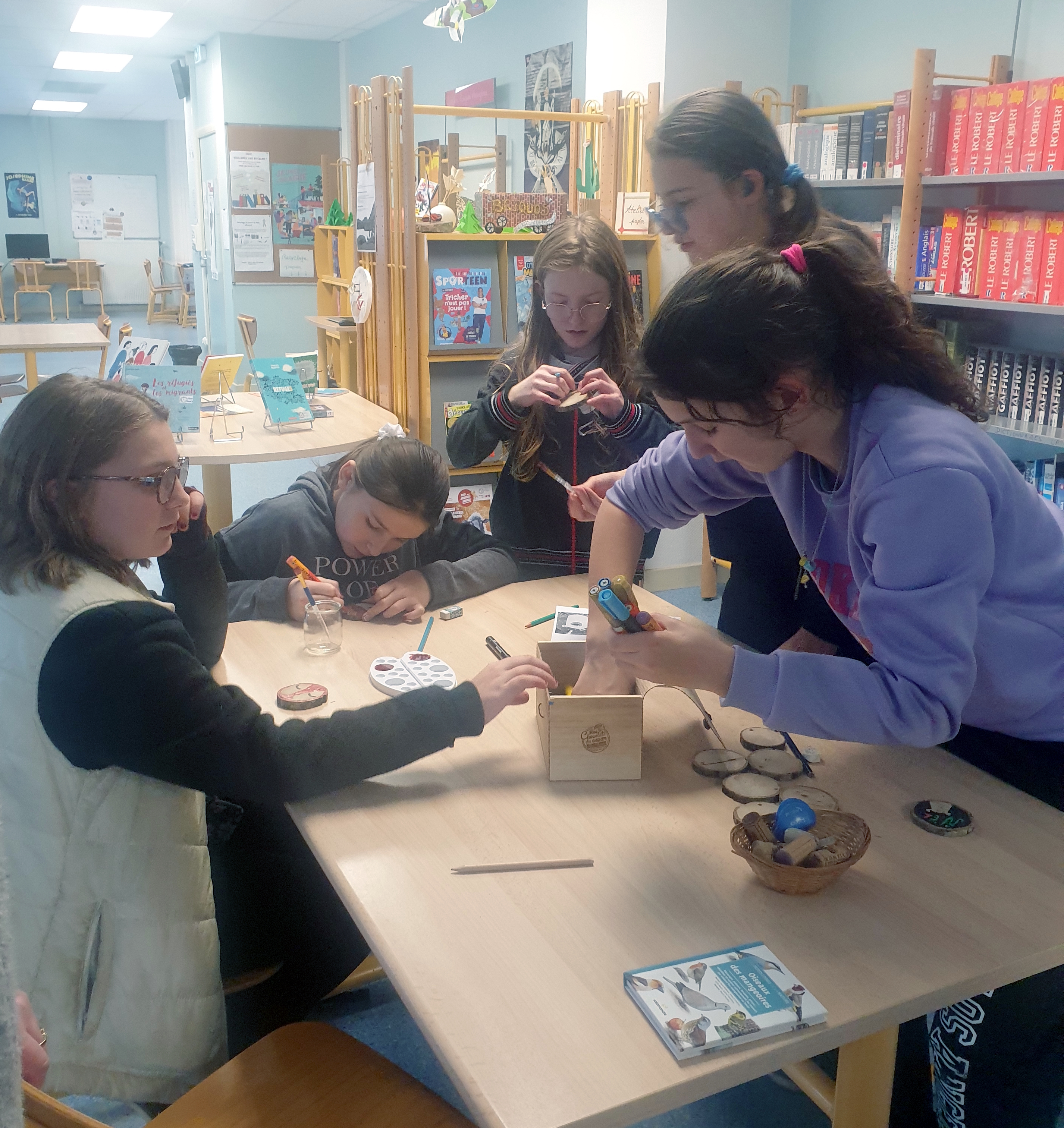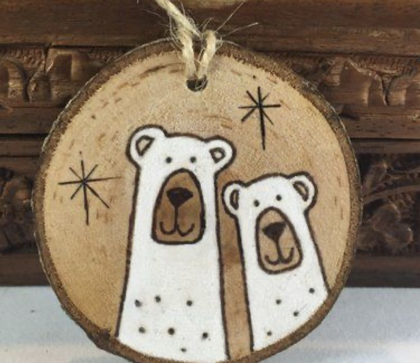 Des tranches de bois (branches sciées) d'environ 5/7 cm de diamètre et d'un centimètre d'épaisseur dans lesquelles on aura percé près d'un bord un petit trou pour passer une ficelle (la coupe et le perçage nécessitent des outils tranchants que seul un adulte peut réaliser... Demande donc de l'aide à quelqu'un de ta famille ! Des feutres peinture, de la peinture acrylique, des pinceaux, de la ficelle pour accrocher.