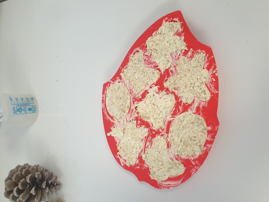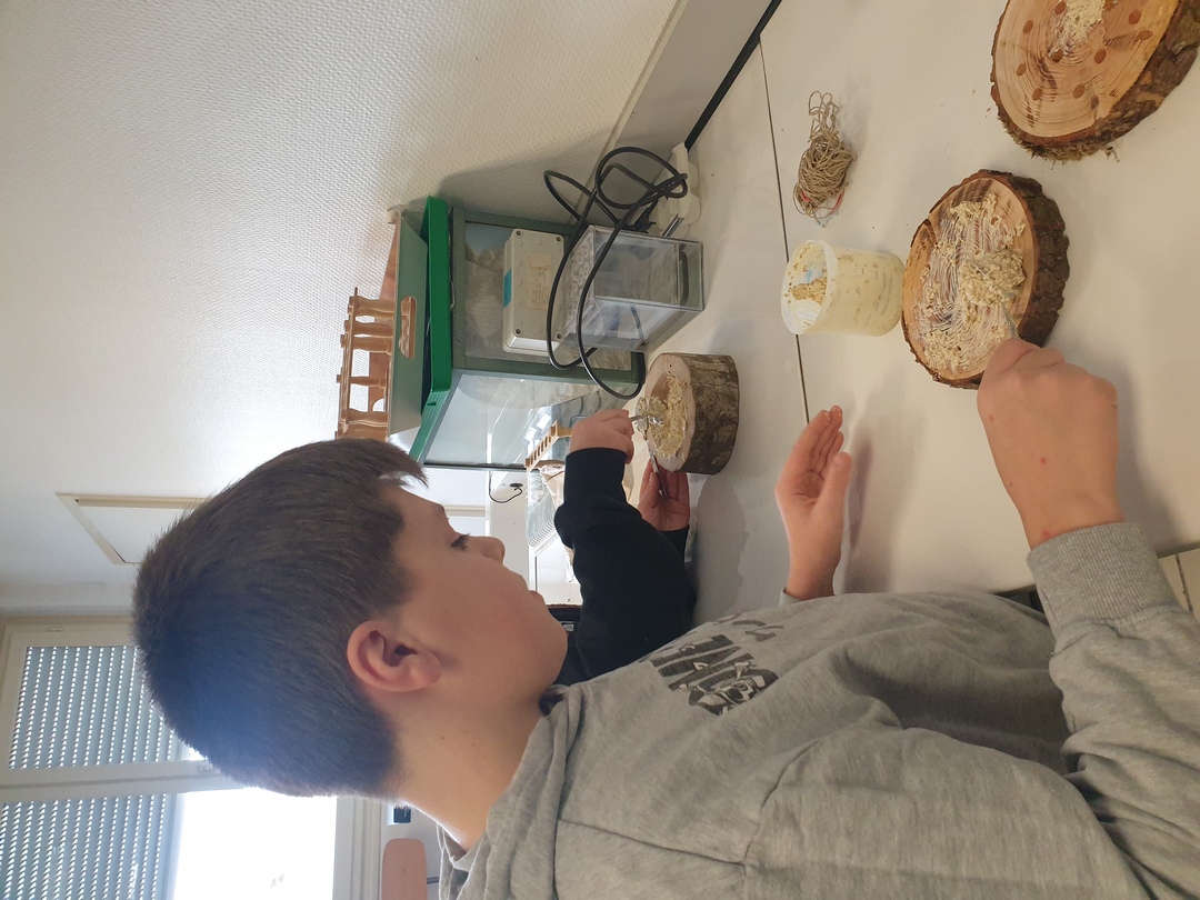 En ce mois de janvier, nous sommes rentrés dans le dur de l'hiver. Nous avons donc décidé d'aider nos amis les oiseaux à mieux supporter cette période froide en mettant à leur disposition de quoi se nourrir. Aujourd'hui, nous avons "tartiné" différents supports : pommes de pain, tranches de bois percées, moule silicone...
