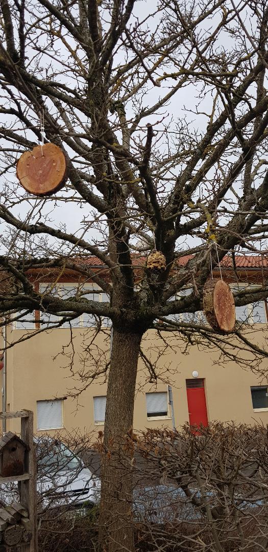 La margarine a bien figé. Nous nous rendons au jardin accrocher nos réalisations dans le branches de l'arbre et en hauteur sur le poteau (pour éviter que les chats errants ne viennent chercher des noises à nos oiseaux...)